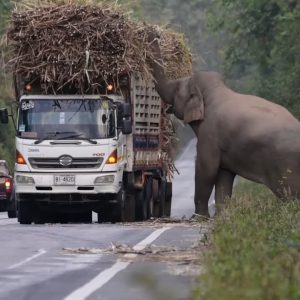 Cute Moment Captured as Greedy Wild Elephant Halts Passing Trucks to Steal Sugarcane