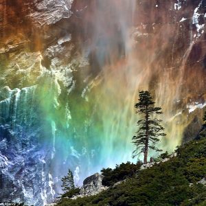 Strong winds at the perfect time of day, 9am, combined with unusually high water volumes for November, created a previously undocumented 2,400 foot rainbow waterfall in Yosemite National Park. Image…