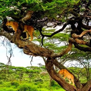 In the heart of a dense jungle, where the sunlight filters through the lush canopy, a peculiar and enchanting scene unfolds. High above the forest floor, agile and fearsome tigers…